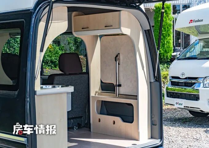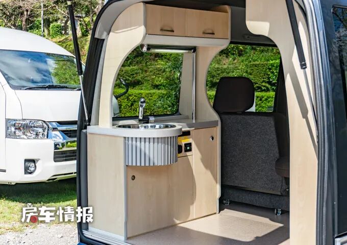 不过刚才我们也说过,沙发能变床其实是床车最基本的一个功能,那么这款车在车厢尾部还配置了一个小型的生活功能区,左侧是一个基础的厨房操作台,配有圆形的不锈钢水槽以及可以抽拉的水龙头,这样也能满足在车外使用水的需求,另外上方还提供了照明灯,搭配上便携式的灶台,就可以满足基础的烹饪需求。