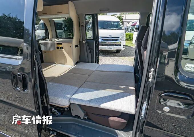 当晚上需要休息的时候,只需要将两张座椅放倒放平,把后方的床板拓展开,床垫铺平,就可以变成一张能够容纳两个成年人使用的简易沙发床了。