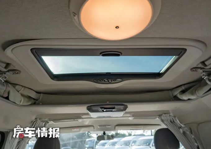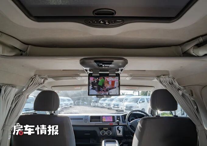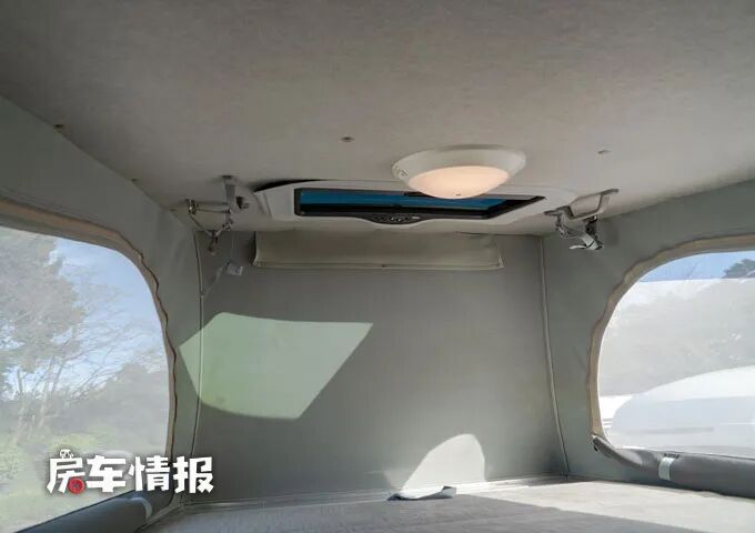另外在前方驾驶室顶部还提供了一台小型的吸顶电视,也能够播放一些简单的娱乐节目,满足日常的娱乐需求。