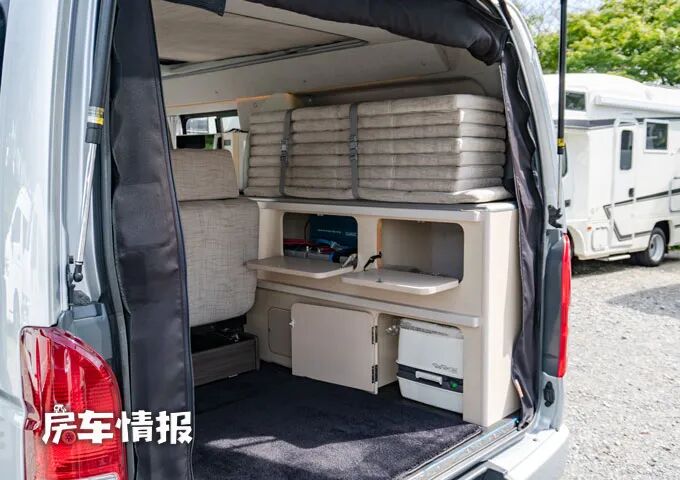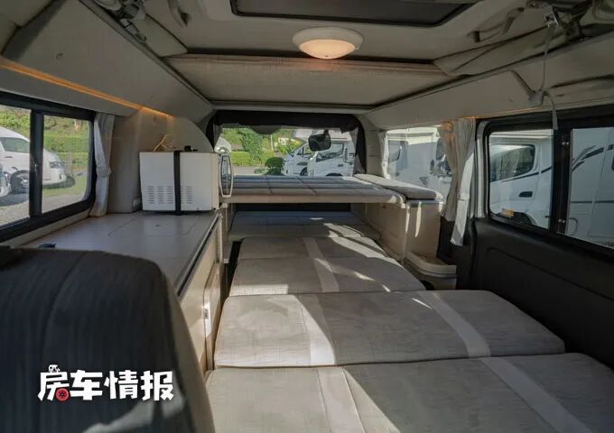 当晚上需要睡觉休息的时候,只需要将前方的两排乘客座椅放倒放平,与后方的床垫相互结合,就能变成一张可以容纳两个成年人使用的简易沙发床,而两侧储物柜上方,还可以架起一张小型的横置床铺,比较适合睡两个小朋友。