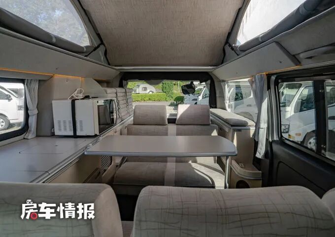 驾驶室后方是双排所以,最前方是三人座椅,后方为两人座椅,日常行车时均可面向前方,驻车之后,则可以将前排三人座椅向后翻转,变成一个面对面的布局模式,中间搭配上一张尺寸不错的大型餐桌,也能够满足日常就餐会客的需求。