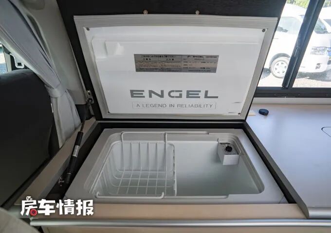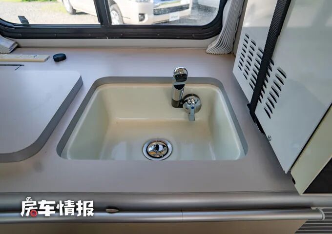 座椅内侧,也就是主驾驶座椅后方,是全车的厨房操作台,台面上提供了基础的水槽、40升的车载冰箱,搭配上便携式的卡式炉,则可以满足基础的烹饪需求。