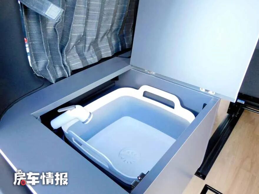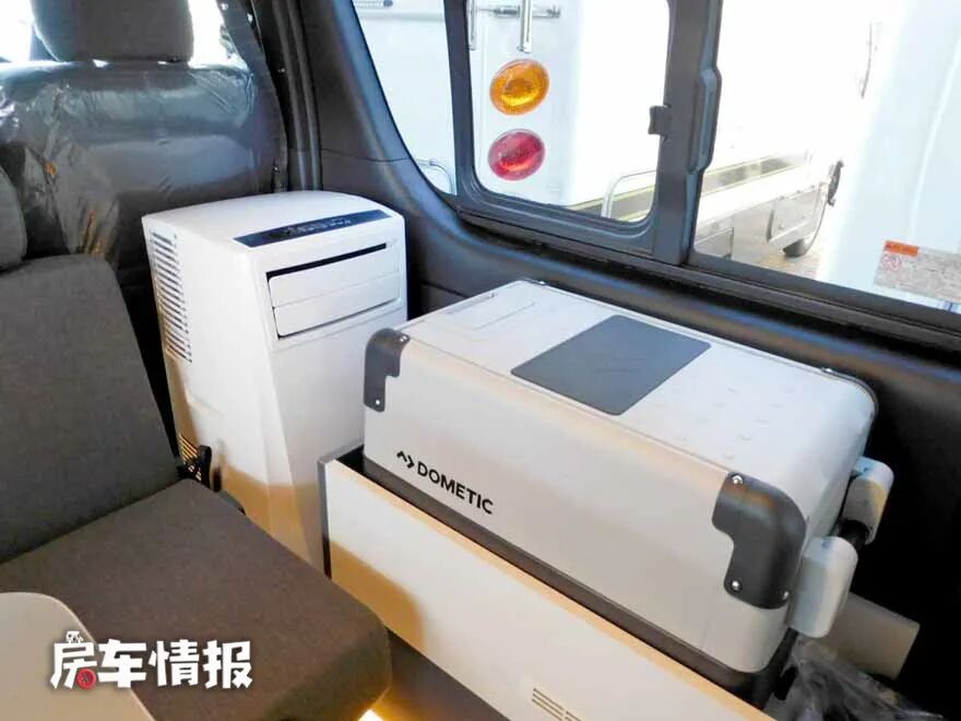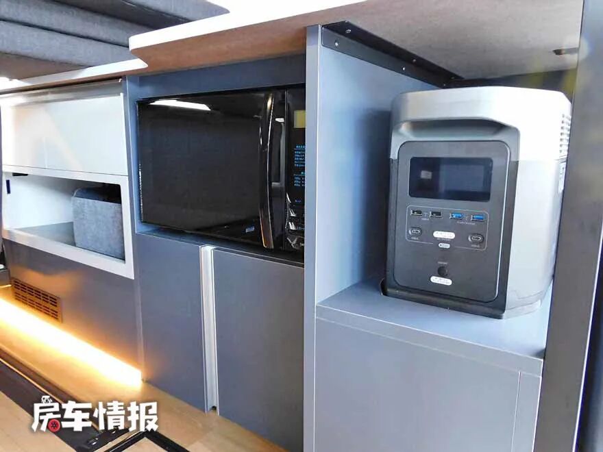 位于车厢内侧提供了一组比较紧凑且功能齐全的设备区域,这里提供了洗菜池、车载冰箱、微波炉,甚至为了给车内便携式设备充电还单独提供了一台充电机,可以为手机、ipad、笔记本等移动设备充电。