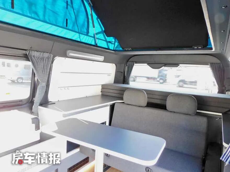 位于沙发床上方还可以在铺设另一张床位,这张床的尺寸约为1700*1500mm,尺寸稍微小一些,但是依然可以满足2名小朋友在这里休息。更有意思的是,当座椅不拼床的时候,这张儿童床依然可以使用,如此算下来车内刚好可以满足4大2小共6人住宿休息。