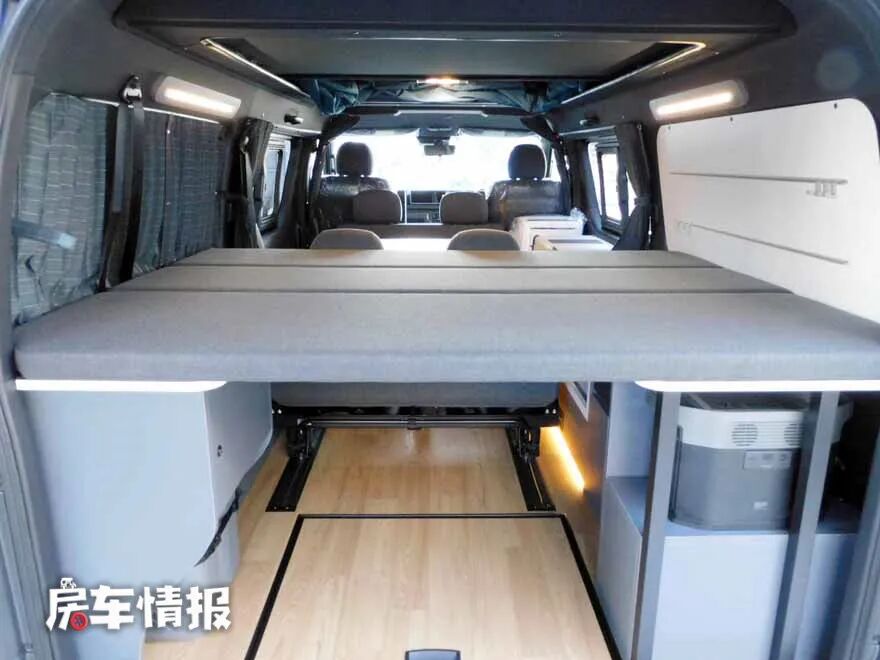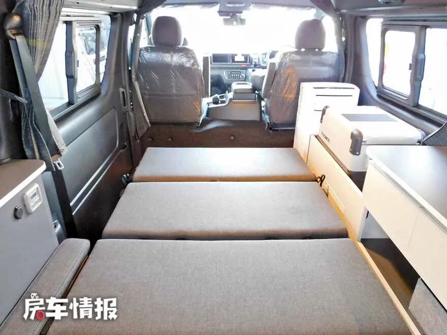除了车顶帐篷内的双人床,在车厢里还隐藏着2张尺寸挺大的床位。第一张就是把车内座椅放平后拼成的超大尺寸双人床,尺寸达到了2000*1400mm,同样可以轻松睡下2名成年人。