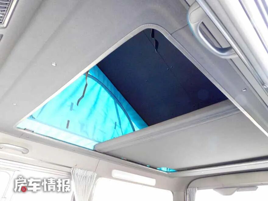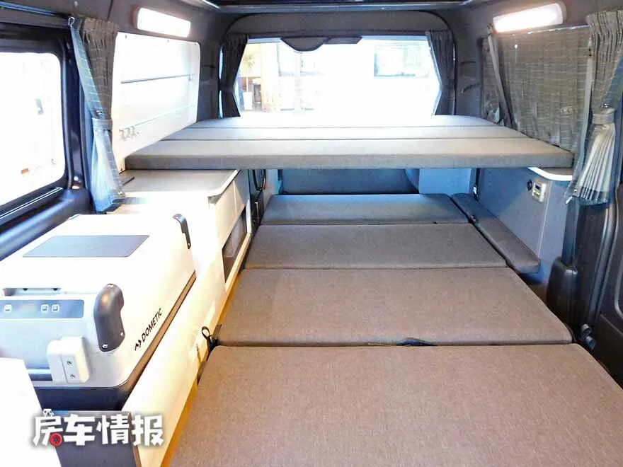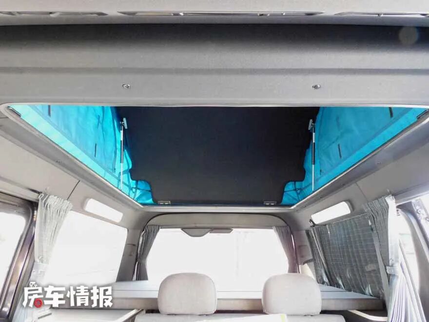位于车厢顶部的升顶帐篷区域内,床板可以向上掀起,打开以后可以增加车内垂直高度,成年人也可以在车内站立。