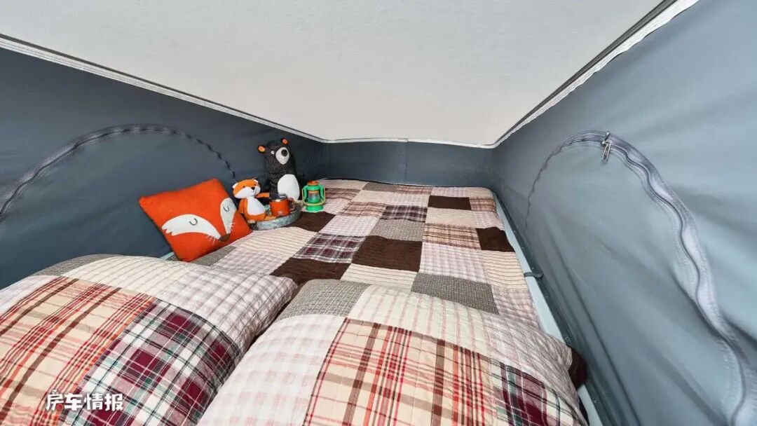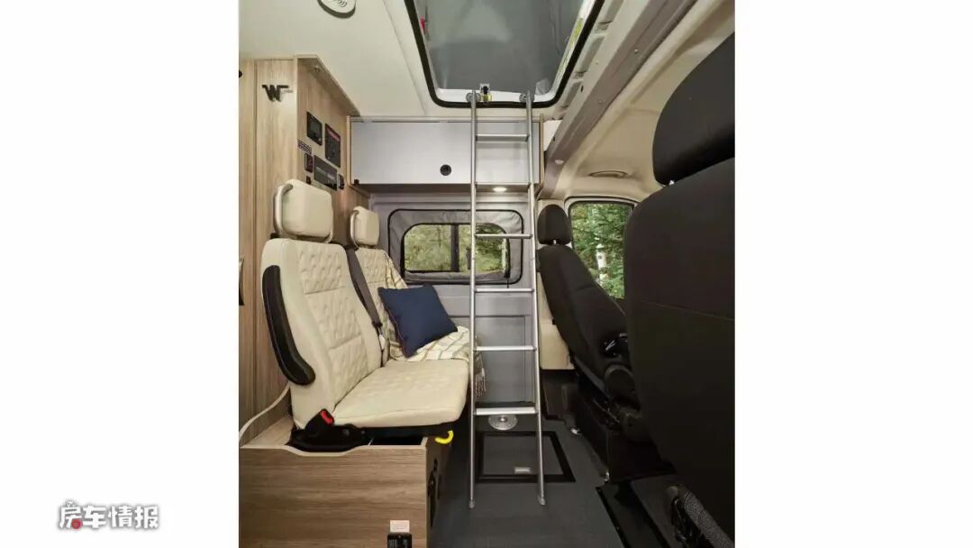 刚才我们说过,这款车的顶部带有升顶机构,作为一款核载四个人的车型,除了尾部的双人床,升顶内也提供了一张标准的双人床,而进入升顶区域内的开头就在会客区的顶部,类似一个天窗的设计,这样搭配上爬梯,就能过轻松的上下了。