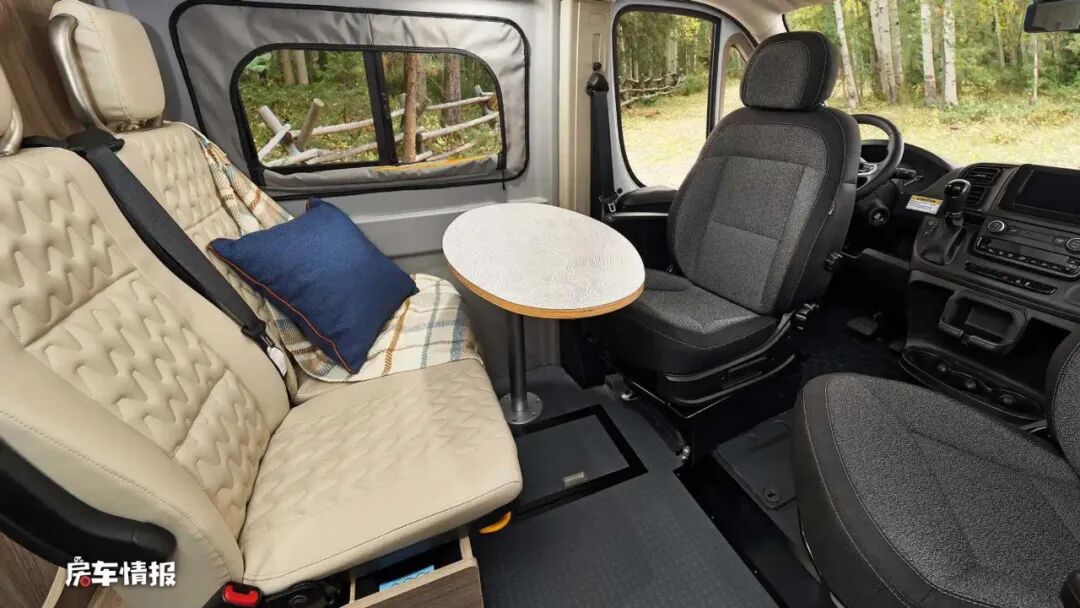 主驾驶座椅后方是全车的就餐会客区域,采用了经典的双人连排座椅+餐桌的设计,驻车时还可以将主副驾驶座椅向后旋转,与之打造成一个可容纳四个人且面对面布局的模式,无论是基础的就餐还是简单的小聚,都是完全可以满足的。