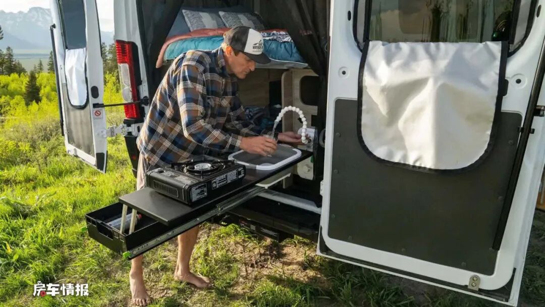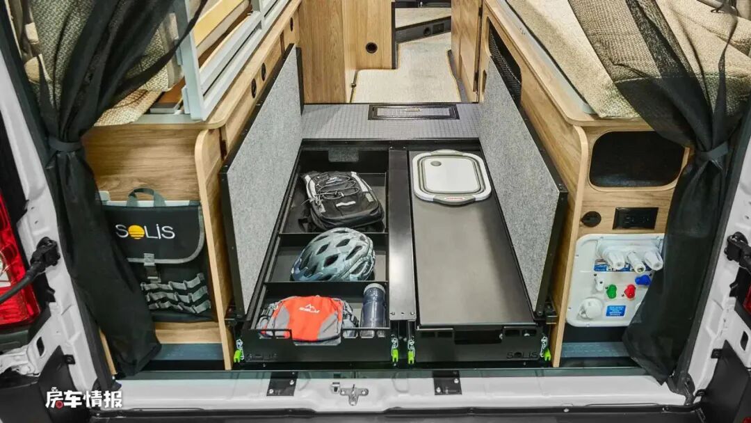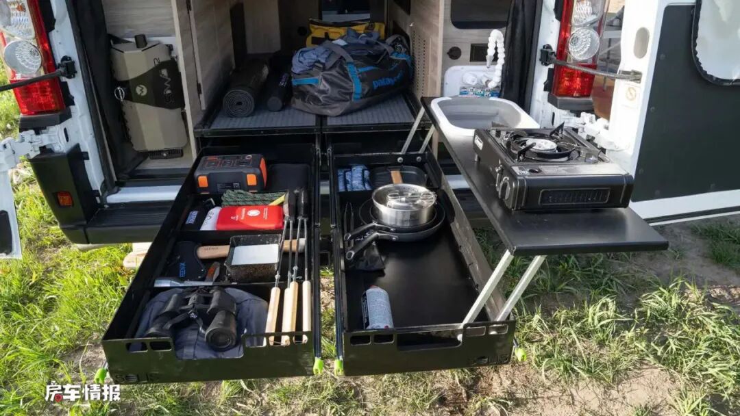 有意思的是,除了车内的厨房区域,打开车尾门可以看到,在床板下方还有一个可以连接室外餐桌的滑轨,这样搭配上便携式的灶台,天气好的时候,也可以在车外进行简单的烹饪,使用起来更加的灵活方便。
