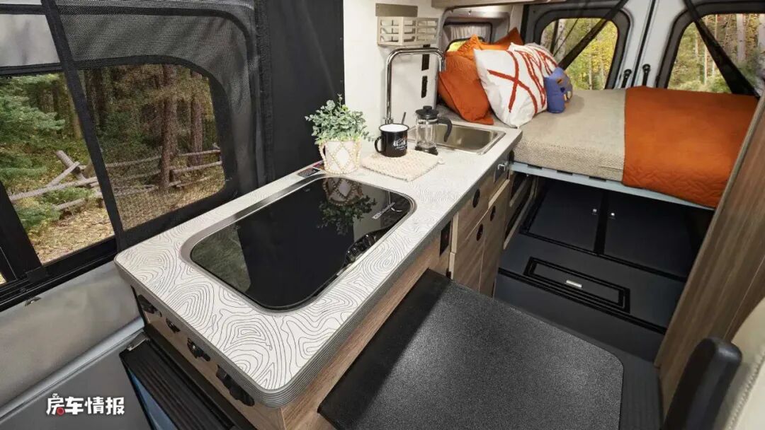 靠近乘客门处的则是全车的厨房操作台,台面的尺寸还是非常不错的,提供了翻盖的双孔燃气灶、不锈钢水槽、冰箱以及储物空间,能够满足在外露营时的烹饪需求。
