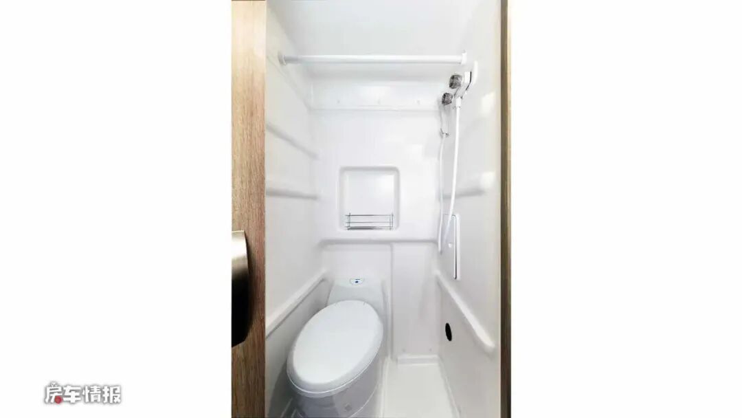 与之相对的则是全车的独立卫浴室,内部空间并不是非常大,但是也能够容纳一名成年人使用,提供了基础的马桶、淋浴花洒和晾衣架,可以满足日常所需。
