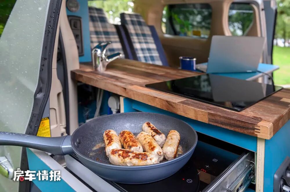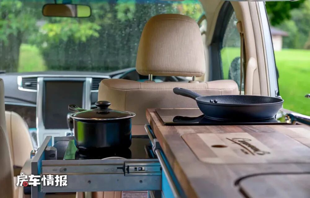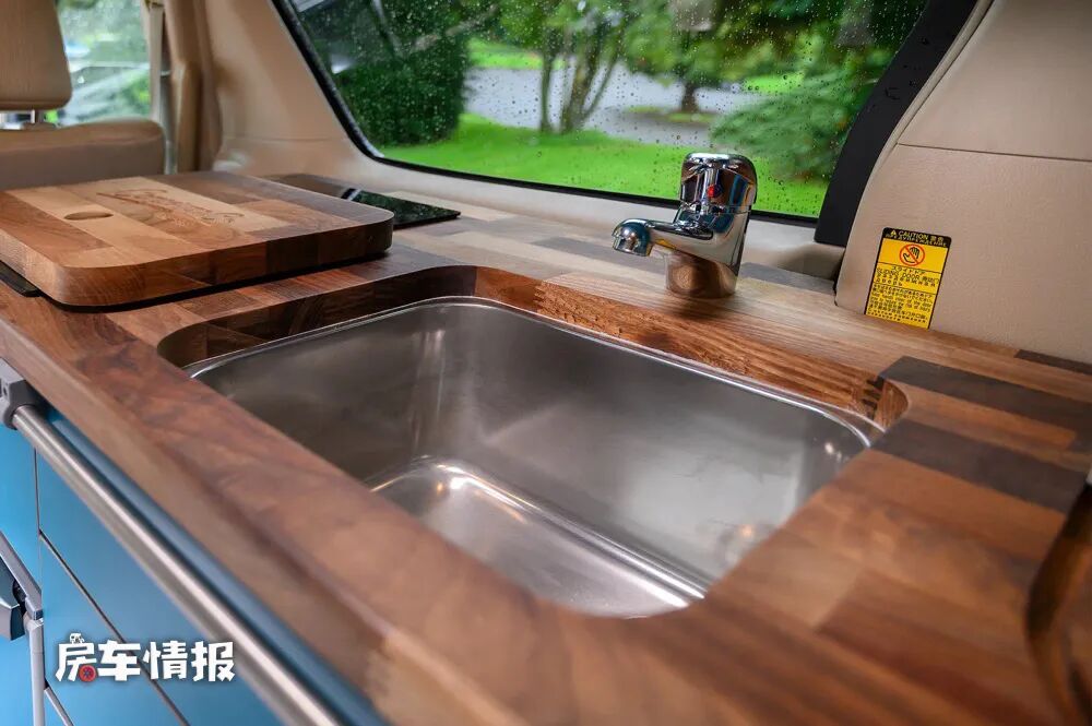而在主驾驶座椅的后方则是全车的厨房操作台,台面上是使用的原木板材铺设而成的,田园风十足,提供了翻盖的翻盖的不锈钢水槽和电磁炉,能够解决日常生活中的基本烹饪需求,外侧还带有抽拉式的电磁炉,这样可以实现双孔开火,车内车外都能使用。