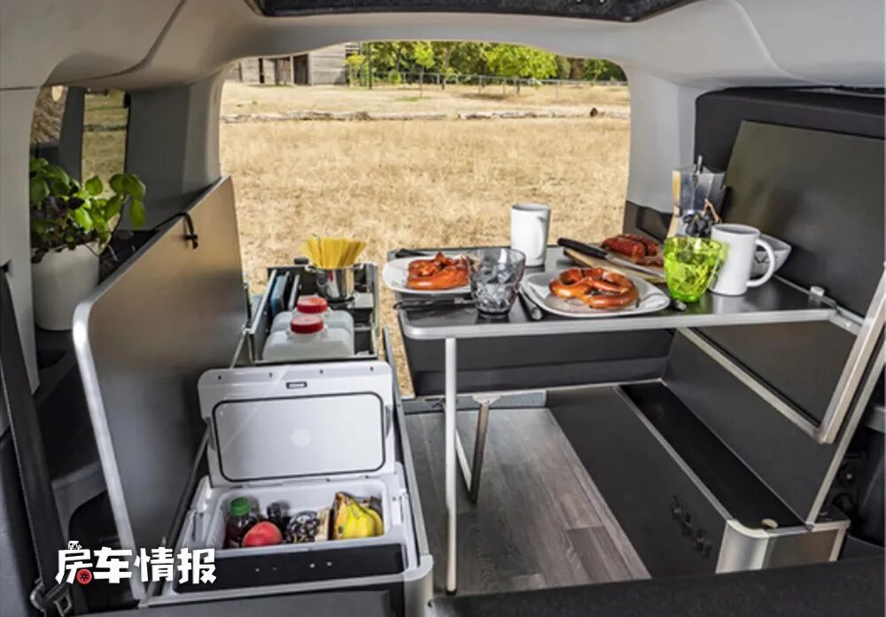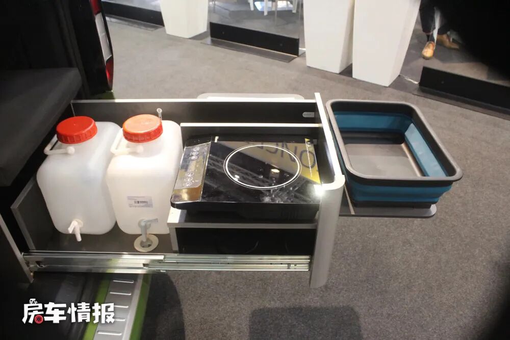 白天的时候,这个区域其实是一个隐藏的厨房,当天气不好的时候,掀开坐垫,就可以看到隐藏在下方的10升的车载冰箱、电磁炉以及便携式的水箱,另外一侧则可以搭建出一个简易的小型就参区域,以满足日常所需。