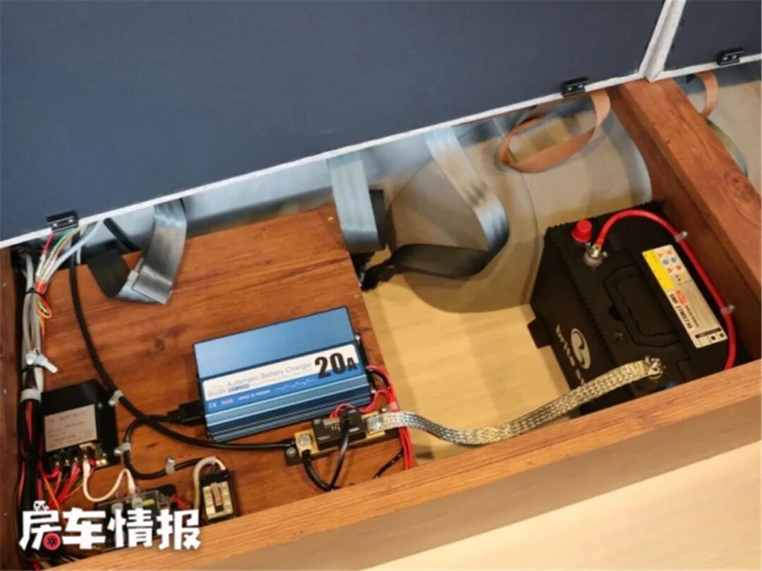 水电配置方面这款车配有200AH的铅酸电池,以及专用充电器,底置水箱等水电配置和国内房车相比也比较简单一点吧。或许当地国情与我国不太一样也未可知,既然有市场,也就有其存在的价值吧。