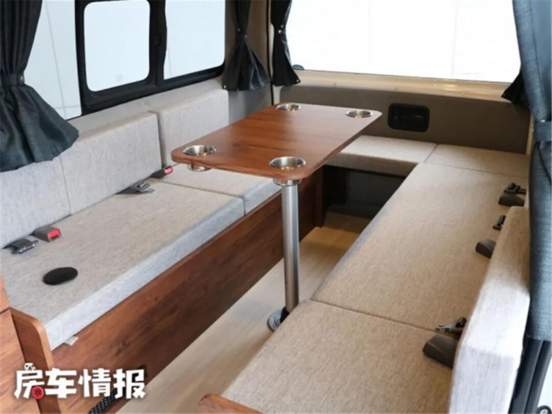 往里面走是宽敞的会客区,双排对卡座大沙发,是6人对坐卡座,如果车内在配上智能电视或者投影仪,开会、教学都不在话下的。中部是一个长长的茶桌,四角都设计有杯托。到了晚上,这个长桌当然也可以下降到水平位置,整个房车拼成了一个大通铺,这个1900*1400mm的超级大床,如果是两个小伙子睡在上面都活动自如。
