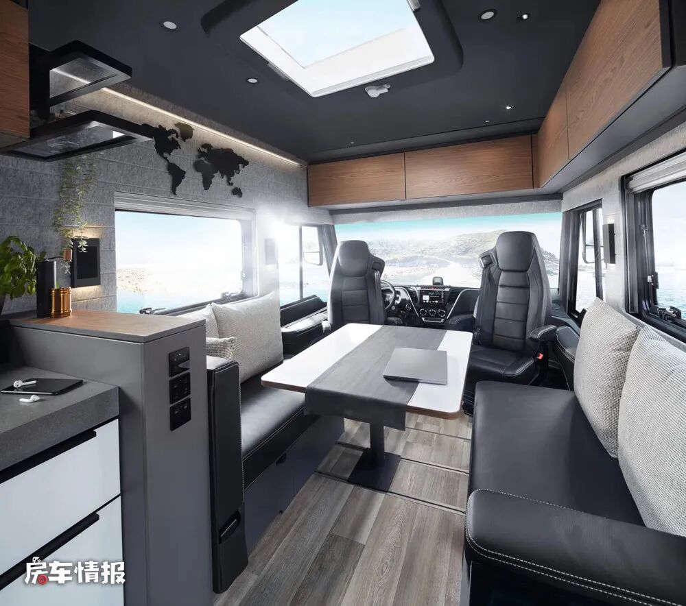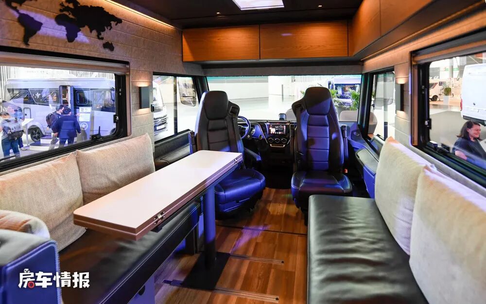 后面是全车的主要会客区域,采用了双排对卡座沙发+大尺寸餐桌的设计,而且全部是全皮软包的沙发,并且配有靠垫和扶手,能为日常乘坐带来不错的舒适度,另外主副驾驶座椅也可以向后旋转,这样当驻车的时候,就可以容纳更多人在这里就餐或者小聚。