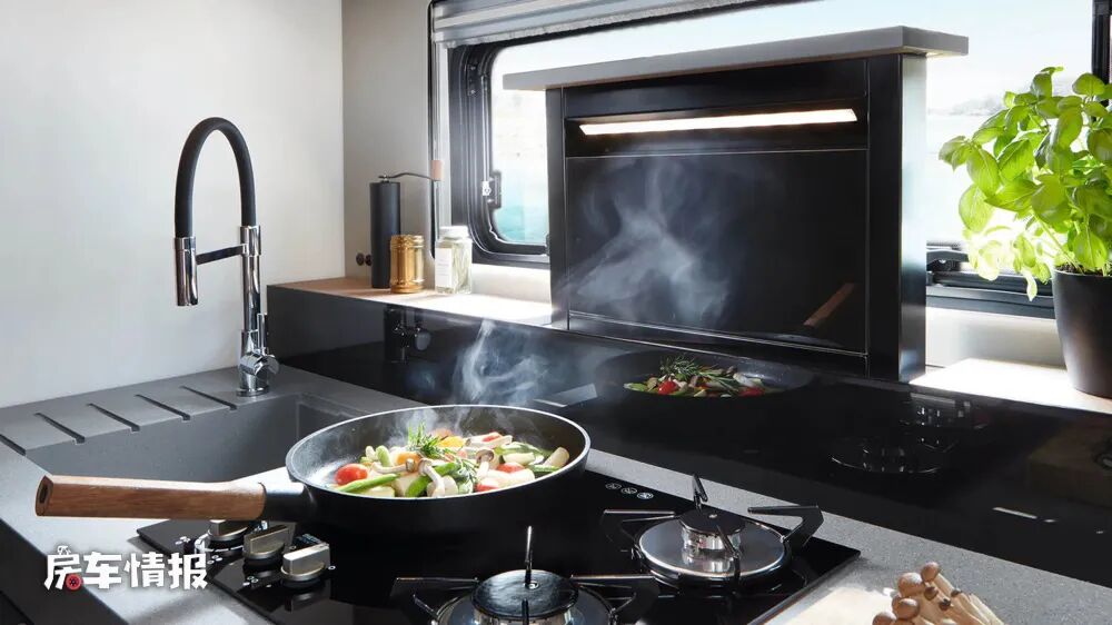 台面上是提供了双孔燃气灶、电磁炉和带盖板的水槽,能够满足日常的基础烹饪需求,下方则是提供了一台烤箱,这一点非常符合欧美人群的生活习惯。