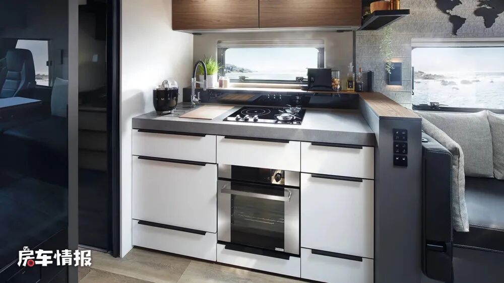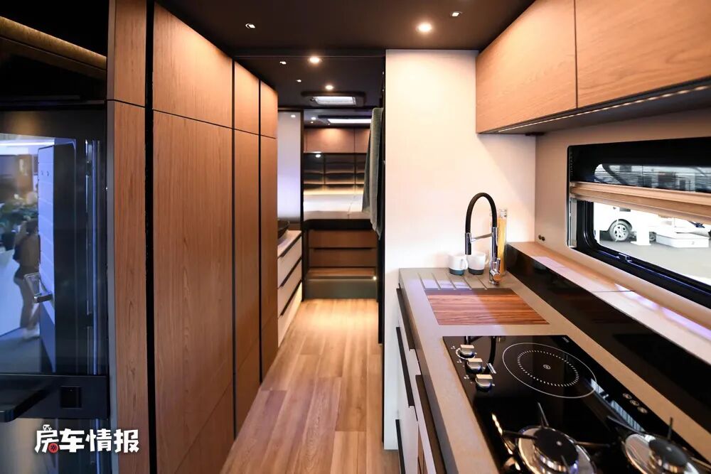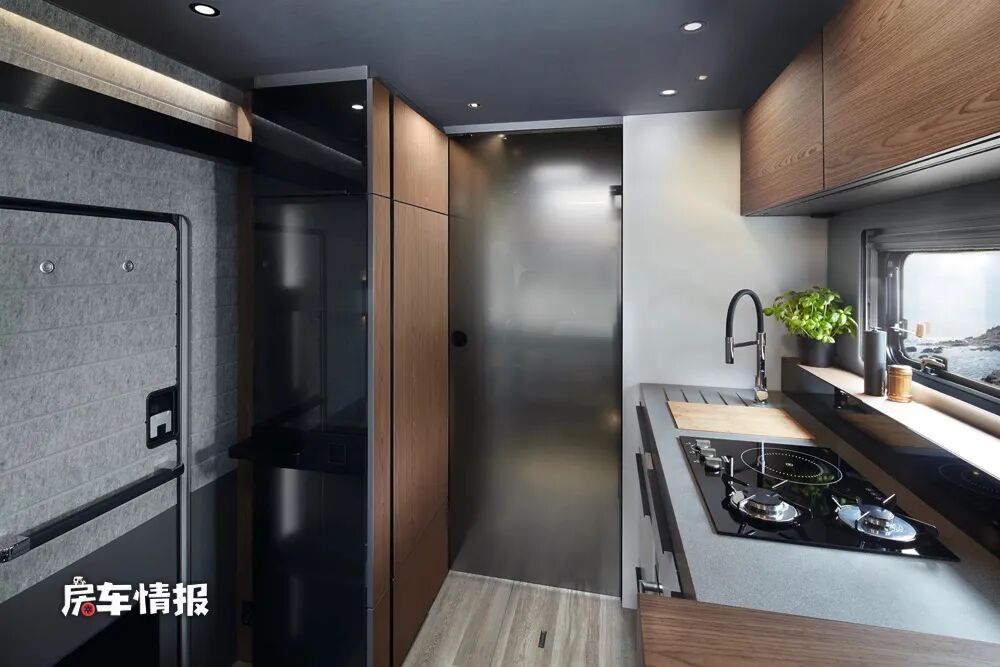 正对乘客门的则是全车的厨房区,操作台的尺寸还是非常可观的,白色的包边和暗色系的内饰形成了强烈的视觉对比,看起来更加的高档有氛围。