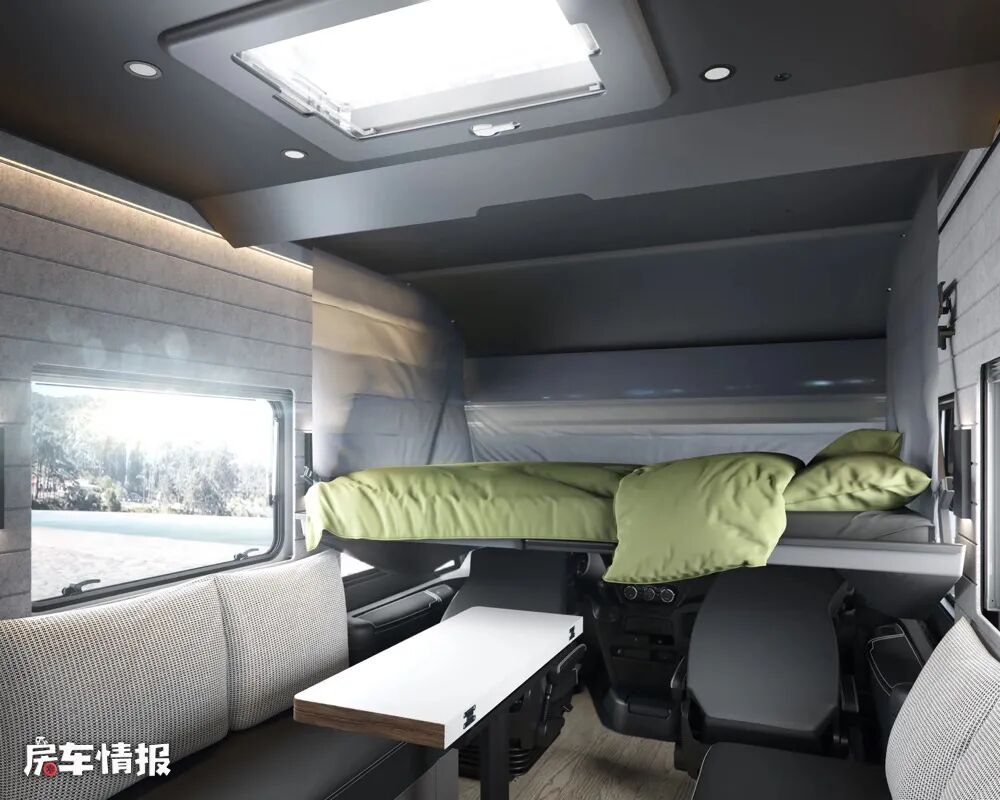 前方驾驶室的上方隐藏着一张可升降的床铺,尺寸为1900*1400毫米,能够满足两个成年人的睡觉需求,白天的时候紧贴天花板也不会影响到下方的空间。