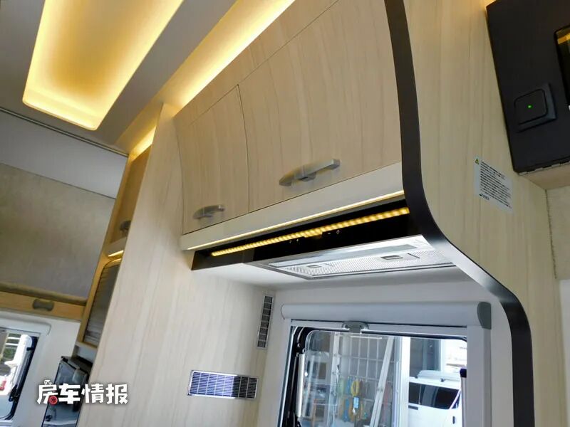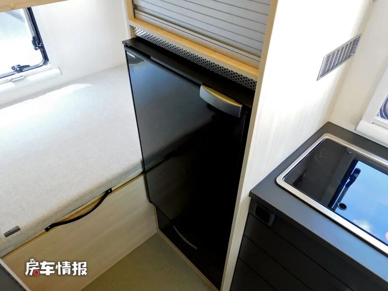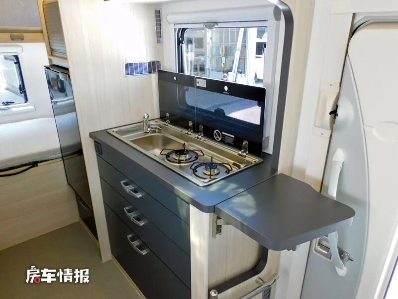 乘客门后方是全车的厨房区域,台面上提供了翻盖的不锈钢水槽和双孔燃气灶,侧面则带有可翻折拓展的备菜桌板,顶部还提供了抽油烟机和照明灯,方便日常使用。厨房操作台后方则是一台85升冰箱和一台微波炉,也能够满足日常基础的生活所需。