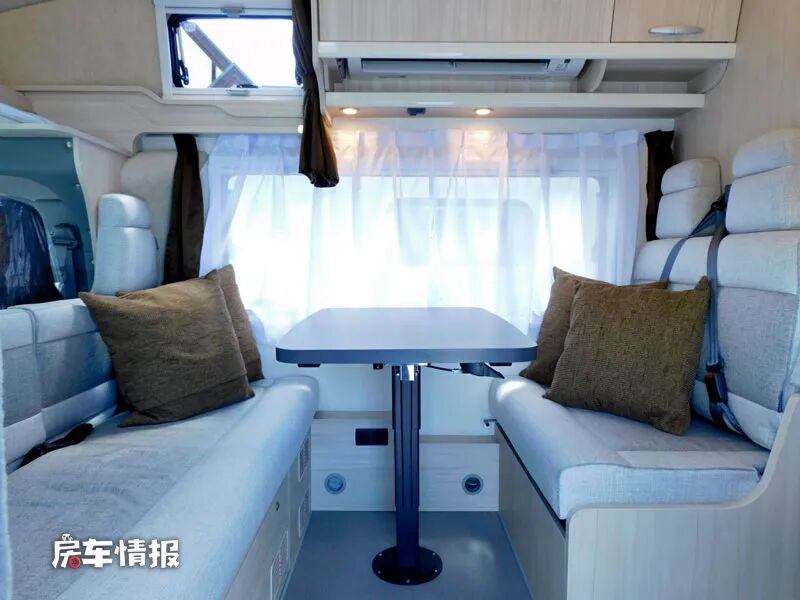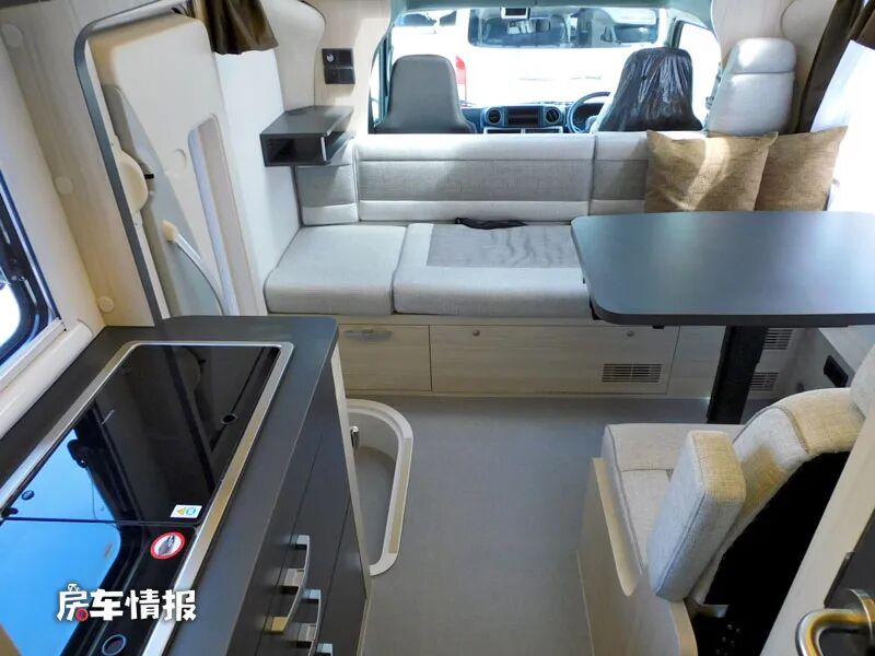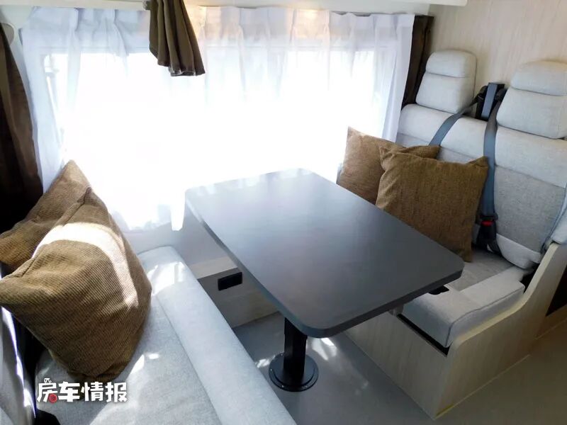 驾驶室后方是一张长条的座椅沙发,和对面的双人座椅形成了一个对卡座的布局模式,中间则提供了一张大尺寸的餐桌,能够满足日常就餐和小聚的需求,晚上对卡座沙发还可以相互拼接成一张L型的床铺,也能容纳一个成年人使用。