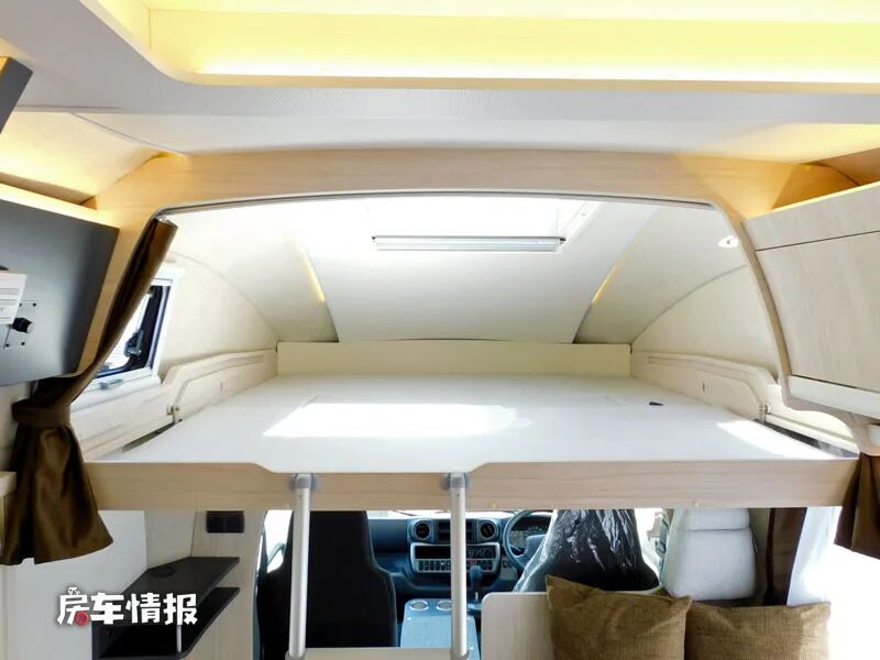 在最前方驾驶室的顶部是提供了一张可抽拉拓展的额头床,能够满足日常的居住需求,并且是三面环窗的设计,可以为内部带来不错的采光和通风。