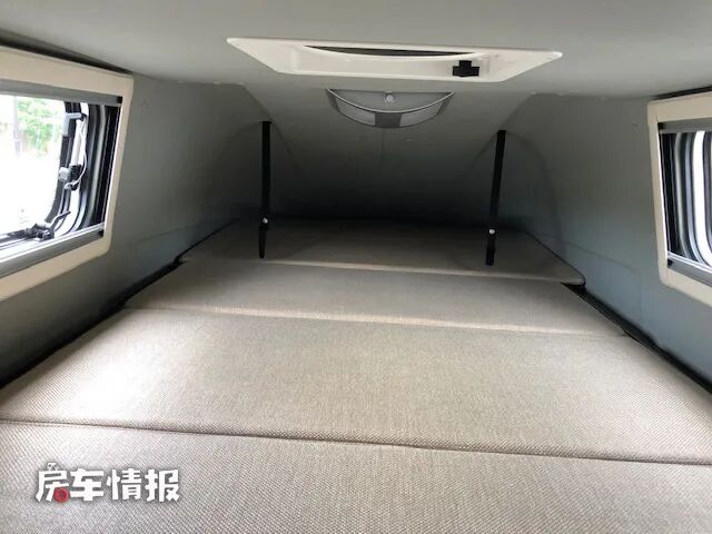 当晚上需要睡觉休息的时候,这款车则是提供了两张双人床,而这个全部得益于它高顶的设计,一张床是下方的两排乘客座椅相互拼接之后打造的,而另外一张床铺则隐藏在天花板上,为一张简易的吊床,白天的时候紧贴顶部不会影响到下方的空间,晚上则将其降下用来满足睡眠的需求。