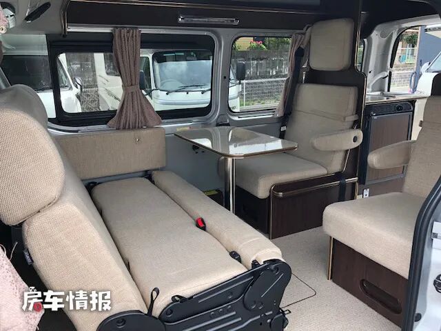 日常行车时可全部面向前方,当驻车之后,前排座椅可以翻折向后与后排的座椅打造成一个面对面的空间,中间搭配上一张小的便携餐桌,也可以进行基础的就餐和会客等活动,另外在前方驾驶室的顶部还提供了一台小型的吸顶电视,也能满足一些日常的娱乐需求。