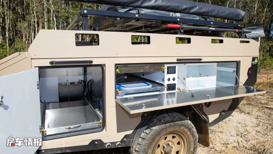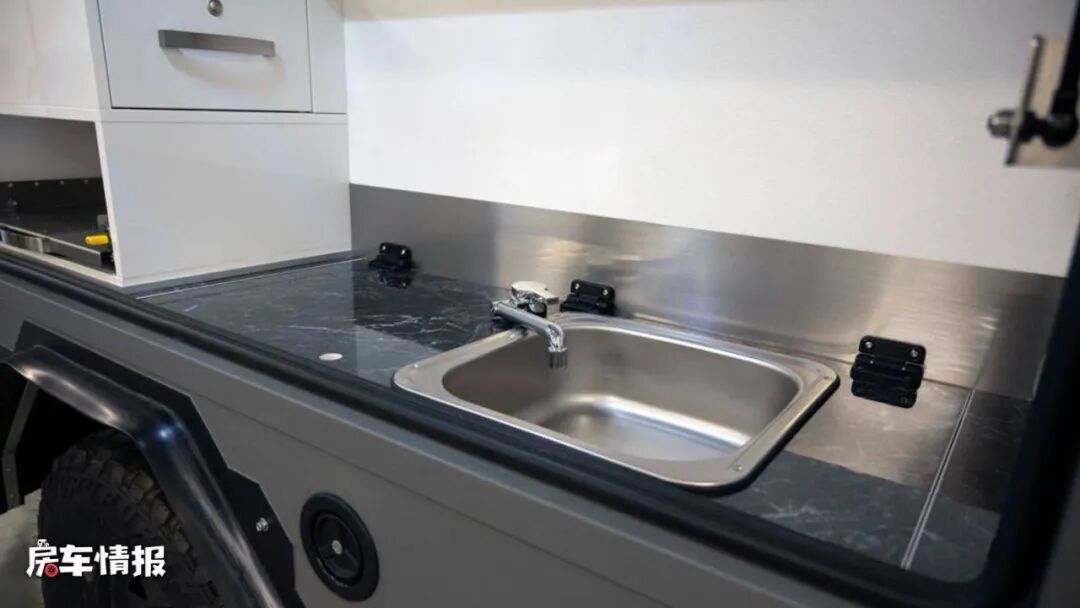 车辆的左侧就比较有意思了,这也是全车的主要功能核心区,因为它其实就是一个被打造成了的户外厨房,打开舱门可以看到内部有一个超级大的厨房操作台,台面上不仅提供了不锈钢的水槽、电磁炉这些基础的设施,还包括了大大小小的储物空间,就像是把自行式房车中的厨房搬到了车外一样,前方打开储物舱的门子,还可以将内部的桌板抽拉出来变成备菜区域。另外全车也提供一个户外的淋浴花洒,可以进行简单的淋浴和洗漱。
