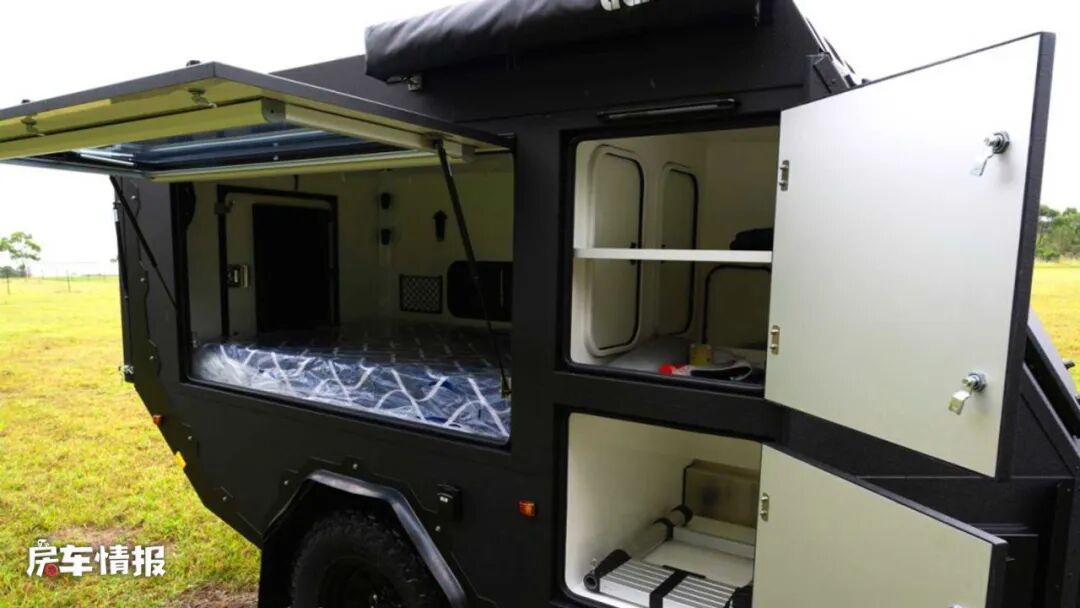 车辆的内部设计比较简单,主要是一张睡床,通过尾门就可以进入内侧,车身右侧还提供了一个大尺寸的可开启窗口,这样好天气的时候也能够躺在床上欣赏美景,感受惬意的生活。那在车辆的最前方还提供了封闭式的储物舱,内部还带有格挡,可以放置一些露营所携带的物品,也方便拿取。