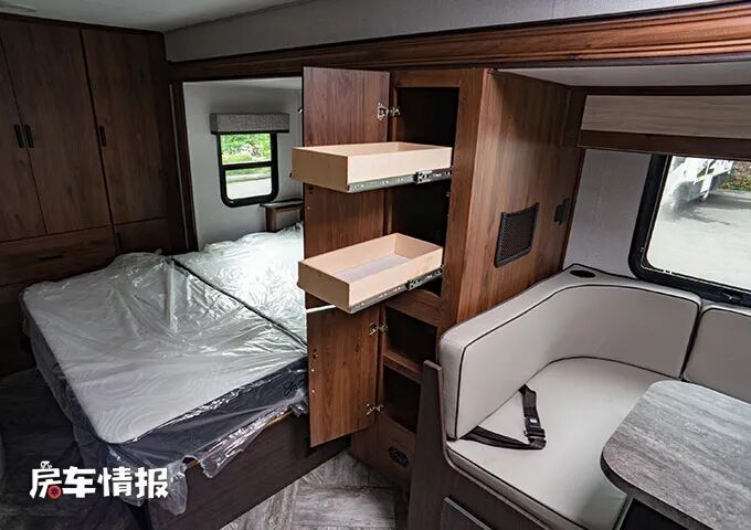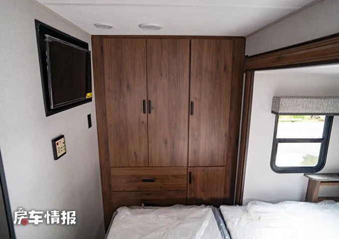 而车尾部的大衣柜也因为拓展打开后呈现了完整的面貌,足够存放和收纳一些日常的衣物和被褥。
