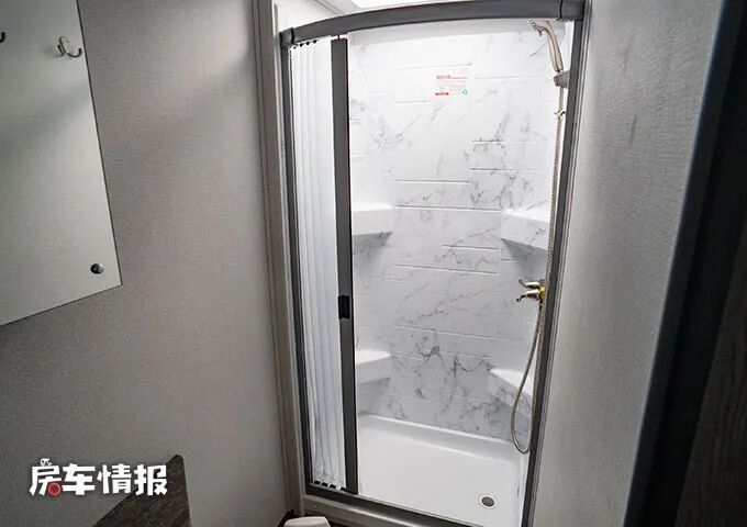 最后就是尾部的卫浴室了,打开位于的门会发现其实内部整体是采用了干湿分离的设计,最内侧是一间独立的淋浴间,提供了淋浴花洒,外侧则是马桶和洗手台盆,一些简单的洗漱可以在这里进行。