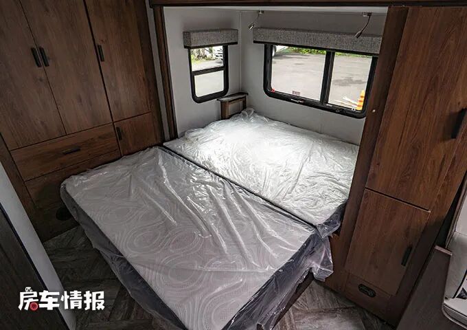 当拓展不打开时,后方休息区的床铺是以一张纵向的小双人床呈现的,但是当拓展机构完全打开时,就变成了一个横置的大尺寸双人床了,完全可以满足日常的睡眠休息需求。