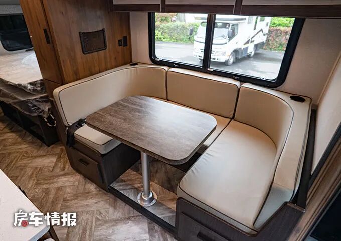 侧面拓展舱内的最前方是全车的就餐会客区域,和我们常见的四座对卡座沙发不不同,这款车使用的是U型沙发配餐桌的设计,皮质的沙发可以提升整体乘坐的舒适度,也多了几分商务风的感觉。晚上还可以组成一张沙发床使用。