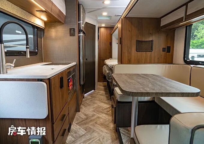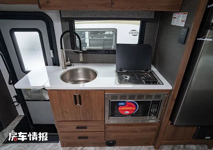 靠近乘客门处的,和会客区相对的是全车的厨房操作台,侧面提供了可拓展的备菜区域,台面上配备了不锈钢的水槽、双孔的燃气灶,下方则嵌入了一台微波炉,可以满足日常的烹饪需求。