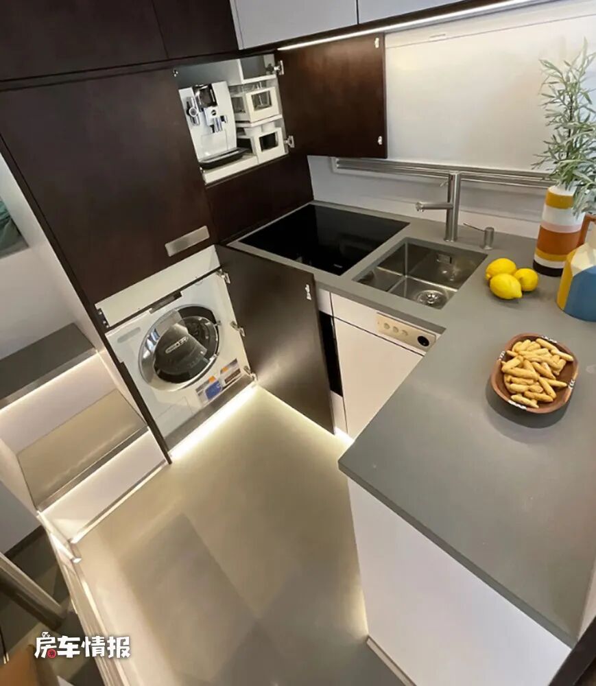 车厢中部是全车的厨房区域,提供了一张为L型的吧台式操作台,配有豪华家电品牌Miele的电磁炉、微波炉、咖啡机和不锈钢水槽,下方还配备了325升可分类储存食材的冰箱,以及一台大型的洗衣机,可以满足日常的生活所需。