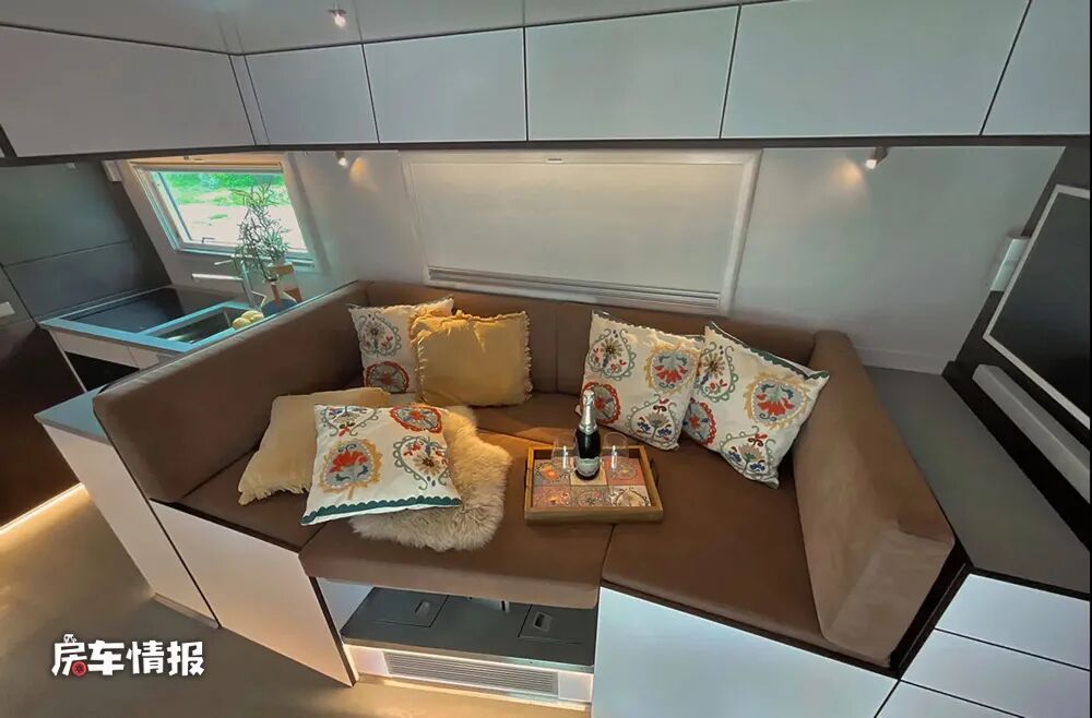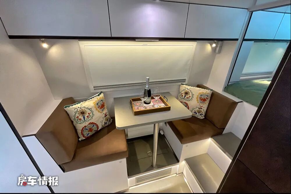 正对乘客门的是全车的会客就餐区域,采用了U型沙发+餐桌的布局设计,顶部配有一排储物吊柜,也提升了整辆车的储物能力,平时可以在这里进行就餐或者聚会等活动,晚上则可以拼接成一张小型的沙发床使用。