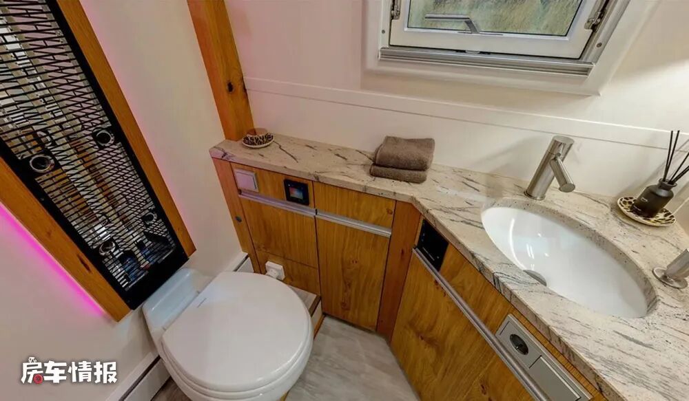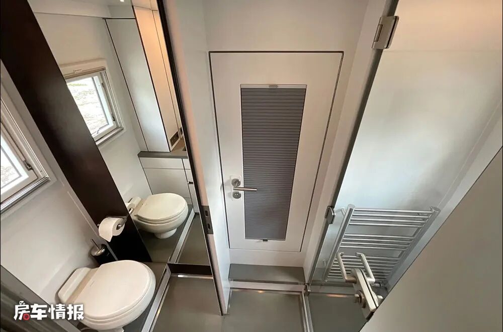 厨房区后方是一间独立的卫浴室,专门为车厢尾部的主卧区而设计的,其中也包含基础的马桶、洗手台盆和淋雨花洒,而且得益于全车的车身尺寸,整体的空间表现也非常不错。