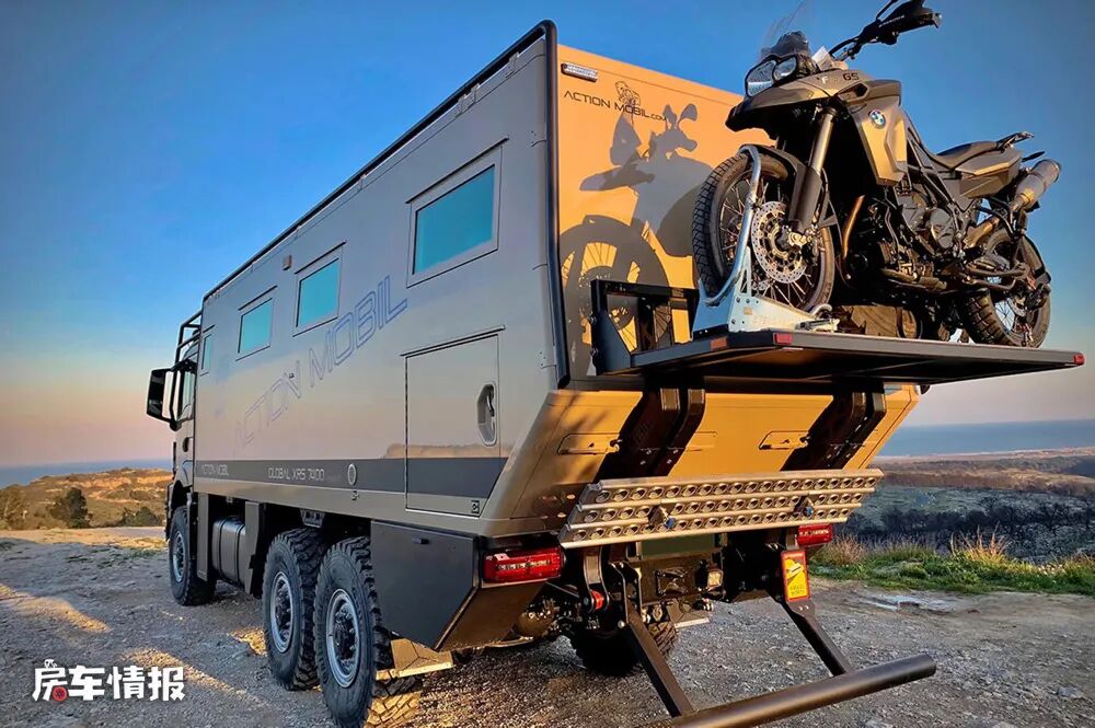 另外为了能够满足更多露营爱好者的需求,车尾部还提供了一个可自动升降的摩托车架,与其说是车架,不如说是一个小型的平台,因为和我们印象中的设计完全不同。