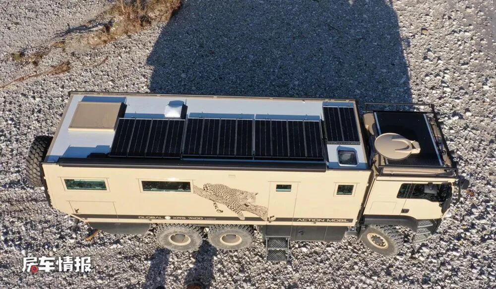 这款车是基于MAN TGS 6x6底盘所打造的,全车的长度达到了10米,加上方正的造型,俨然是一辆庞然大物,车厢顶部以及车头顶部都带有保护杠,车顶还配备了6个户外探照灯,车身下方加装了一圈全熏黑的包围,内侧还隐藏着户外厨房等配套设施,使整辆车不仅具备一些防护的功能,同时还能够满足户外生活的需求。