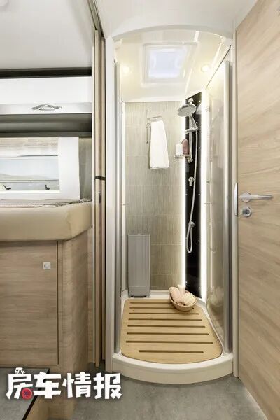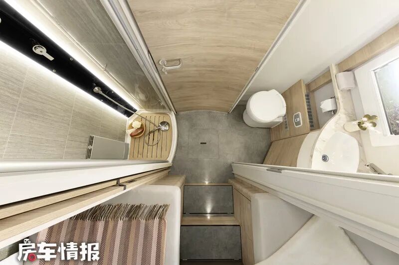 在通往尾部休息区的过道两侧分别是全车的淋浴间和卫生间,卫生间内提供了可旋转的盒式马桶、洗手台盆和梳妆镜,能够进行简单的洗漱,另外一侧的独立淋浴间内则提供了单独的淋浴花洒,休息之余好好洗个热水澡还是非常舒服的。