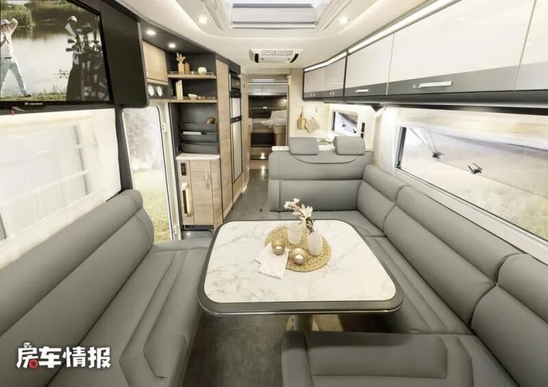 水电方面,这款车是提供了150安时的电池以及230升的淡水箱,同时车内的地板也带有加热功能,能够为车内保持一个相对舒适的居住环境,另外整辆车还提供了一台32寸的液晶电视,可以满足日常的娱乐需求。