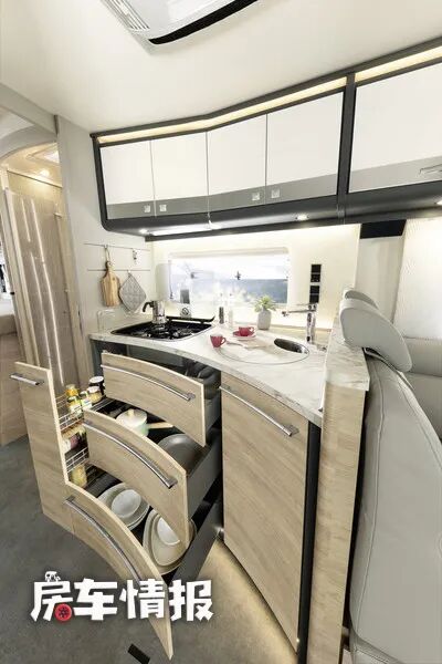 位于会客区后方,正对乘客门的地方是全车的厨房区域,采用了圆弧形的设计,更节省了过道的空间,台面上提供了多孔的燃气灶、水槽等基础设施,同时在操作台的下方还提供了多处储物空间,足以满足日常的存放需求。