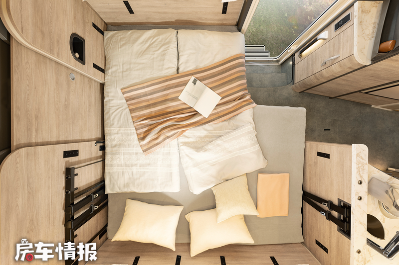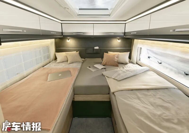 车尾的睡卧区常规状态下是两张独立的单人床,尺寸为2000*850毫米,均可以躺下一名成年人,当有需要的时候,它也可以转换成一张大尺寸的床铺。