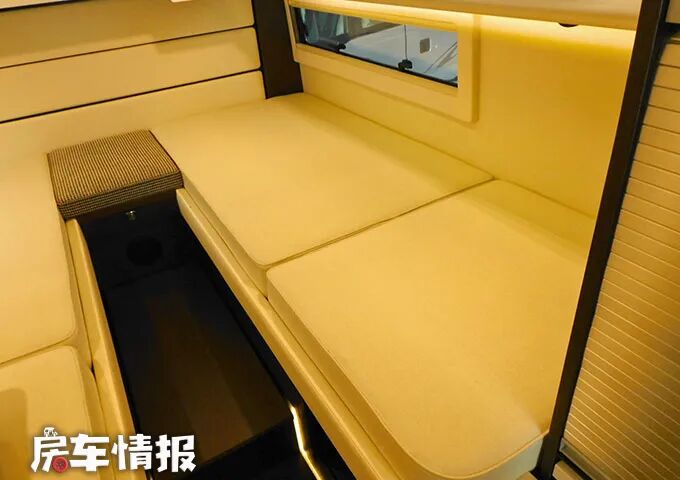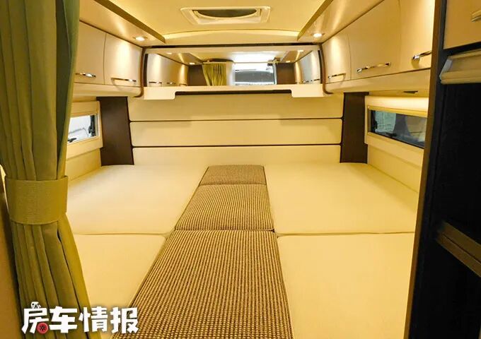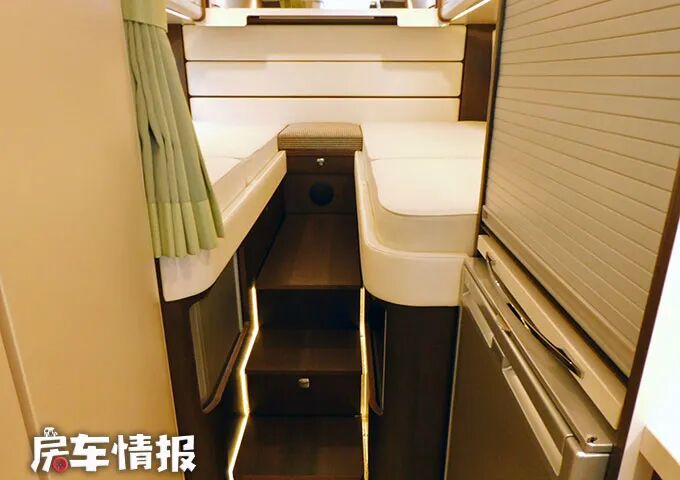 车厢尾部的高度要高于前方生活区,所以需要借助台阶,整个尾部是打造成了一间比较私密的卧室,常规状态下为一左一右两张单人床,必要时也可以将其进行拼接组合,变成一张通铺,最多能够满足一家三口之需。
