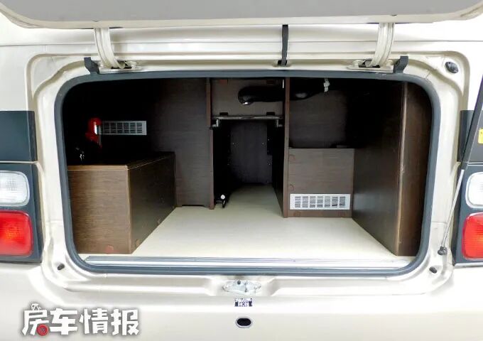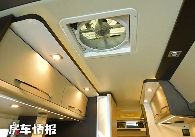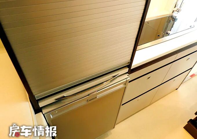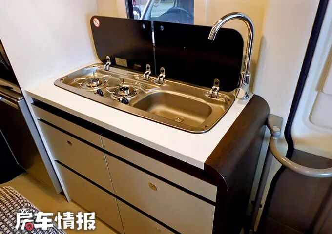 厨房操作台的尺寸还是比较不错的,台面上提供了翻盖的双孔燃气灶和不锈钢水槽,日常的基本烹饪需求还是能够满足的,而厨房区的上下方则配置了多个储物空间,整体上也提升了全车的储物能力。