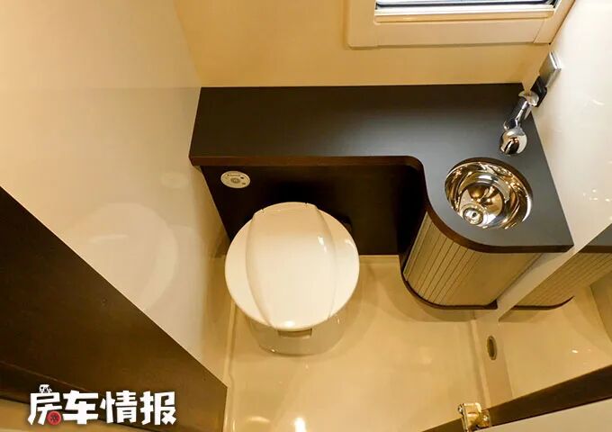 与之相对的卫浴室空间表现一般,可能因为日本房车的卫浴室空间都不是很大,但是好在提供了基础的设施,包括马桶、洗手台盆、全身镜和淋浴花洒,也能容纳一个人在此完成简单的洗漱淋浴和如厕。