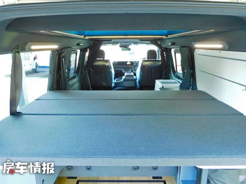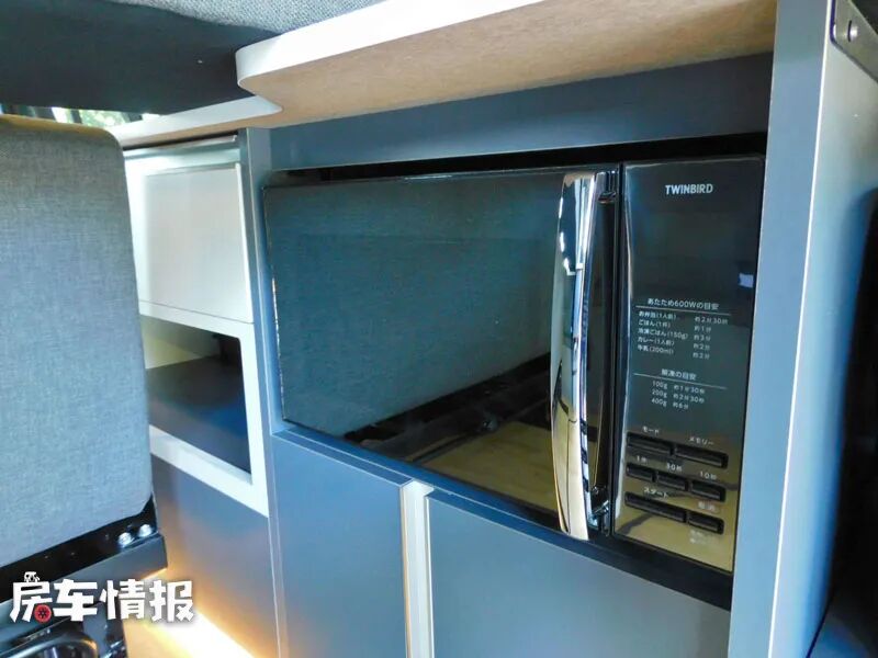 车尾部是一左一右提供了两个厢体,一侧是作为储物柜使用,一侧则嵌入了一台微波炉,可以做一些简餐使用,晚上的时候铺好床垫,就形成了一张横置的床铺,另外尾部窗户还进行了盲窗式的设计,也足以保证内部的隐私。