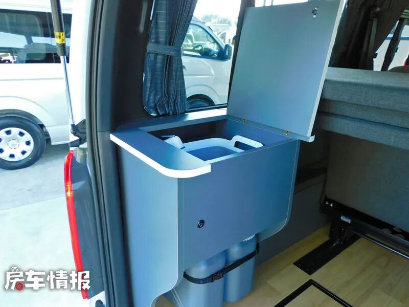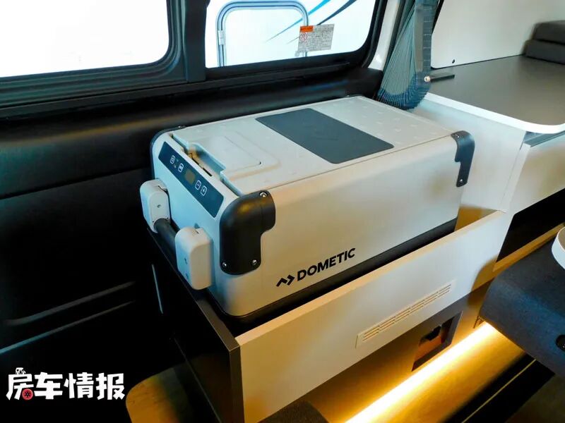 主驾驶座椅后方不是我们日常所见的常规厨房操作台设计,而是放置了一台26升的便携式冰箱,这样坐在会客区拿取食物就更加顺手方便了。