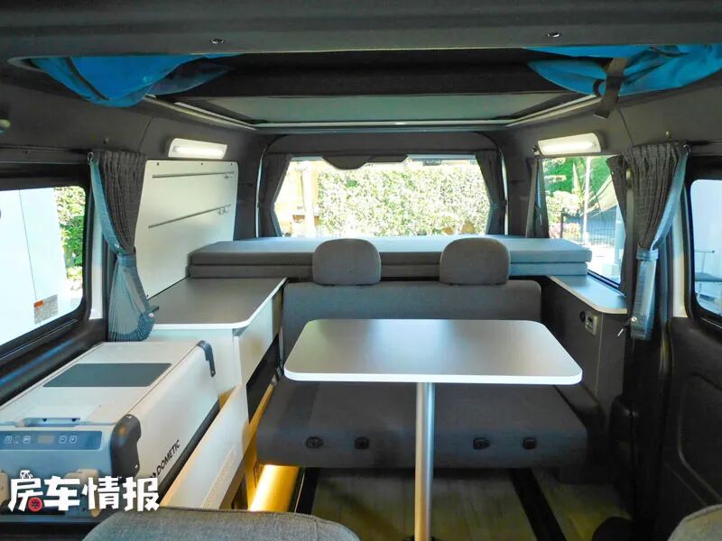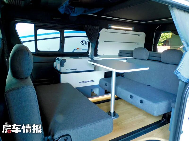 车内提供了两排双人乘客座椅,日常乘车时均可向前,当驻车之后则可以将前排座椅向后翻折,与后方座椅打造成面对面的布局模式,中间安装上可拆卸的餐桌,一个小型的四人会客就餐区域就完成了。